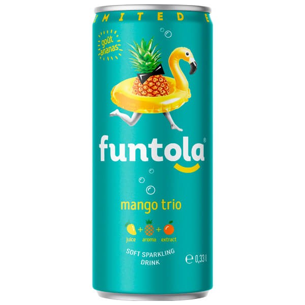 Ingredienser: vand, sukker, surhedsregulerende citronsyre, stabilisatorer (gummi arabicum, glycerolester fra rodharpiks), appelsinskalekstrakt (0,02%), mangojuicekoncentrat (0,7%), ananasaroma, konserveringsmiddel natriumbenzoat, farvestof: E102*, E110*.