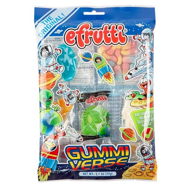 Tag en tur ud i rummet med den nye Efrutti Gummi Verse-pose, der har en bred vifte af søde og syrlige vingummier fra universet. Alle produkterne fra eFrutti Gummi Verse er fedtfrie, uden spor af nødder, uden gluten og nogle gensplejsede ingredienser.