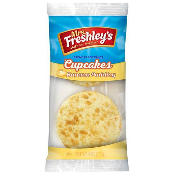 anana Pudding Cakes er en frisk, gylden cupcake som indeholder en creme med naturlig smag af banan, og kagen er overtrukket med glasur samt krymmel af vaniljevaffel. En skøn, sød kage, som helt sikkert rammer plet! Perfekt at komme i madkassen eller madkurven til skovturen! Med naturlig smag af banan. Naturlige og kunstige smagsstoffer. Lavet med vaniljevafler. Banana Pudding Cakes præsenterer friske, gyldne cupkager med crème af naturlig banansmag og glasur samt krymmel af vaniljevafler. Disse cupkager med bananbudding leveres i pakker med to styks fordi, lige så snart du har spist en, vil du garanteret have endnu en!